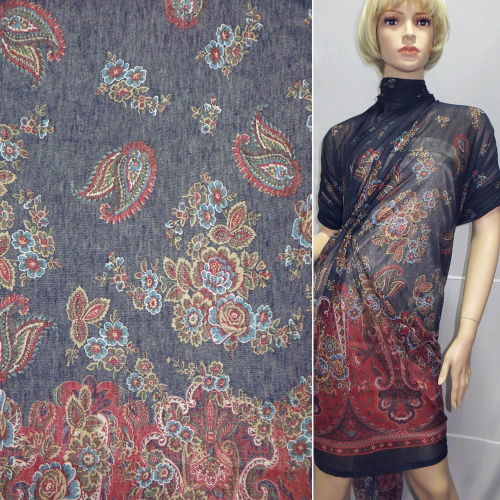 Трикотаж с шерстью синий темный бордовый купон в цветы ш.142 купить в розницу и оптом