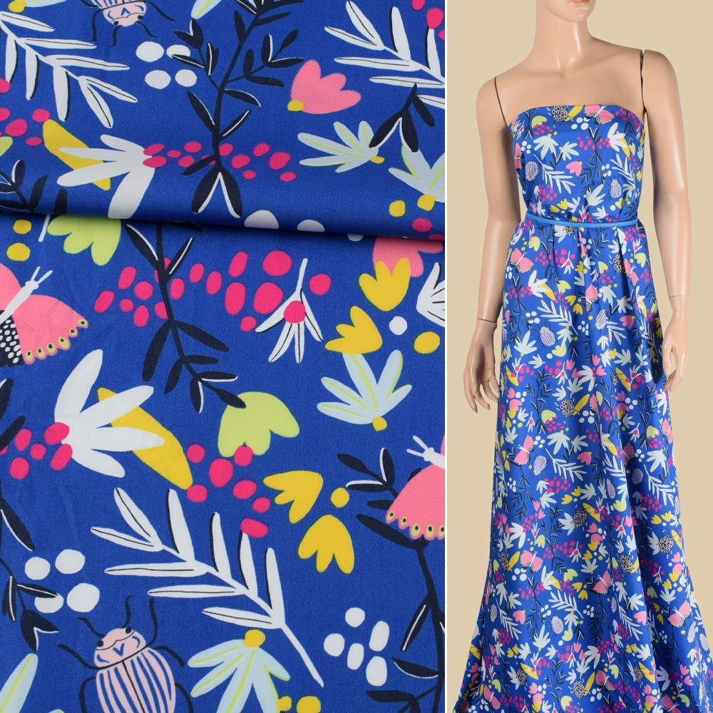 Коттон синий, розовые бабочки, жуки, белые, желтые цветы, ш.147 купить в розницу и оптом