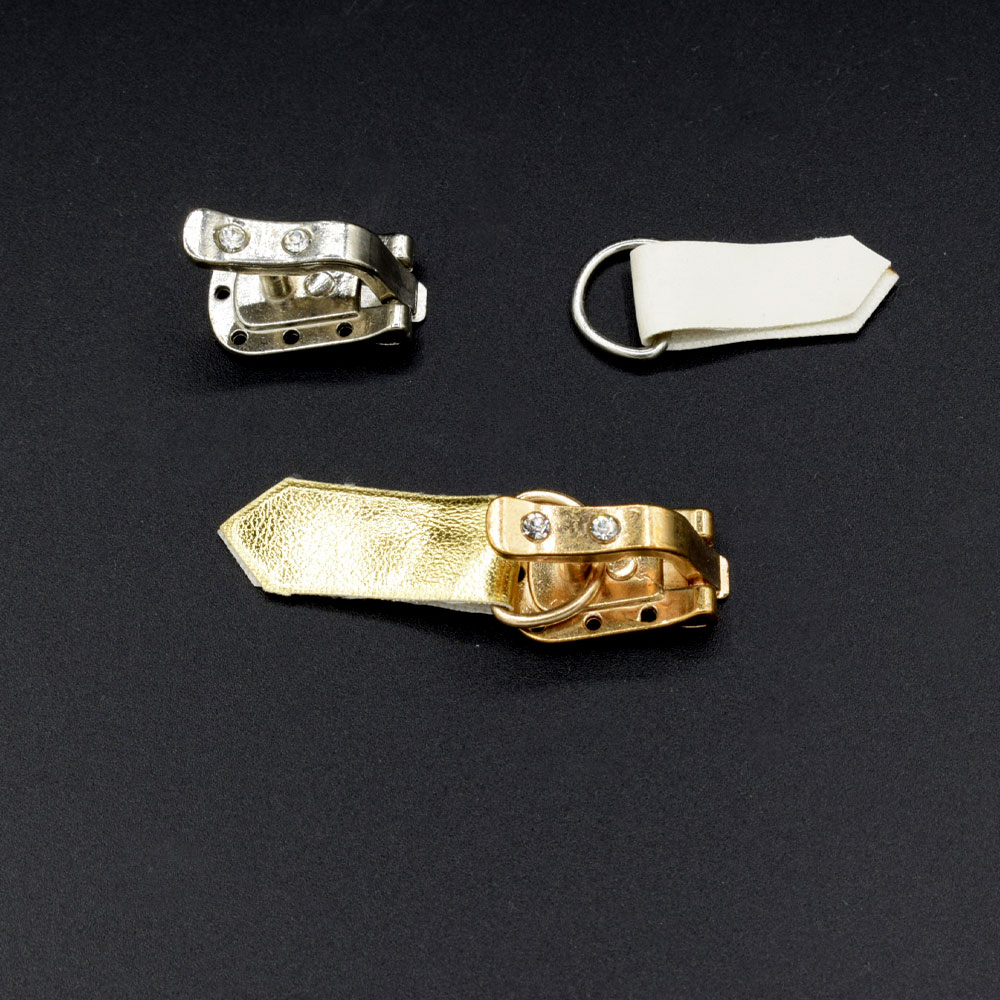 Крючек шубный металл кожзам со стразами золотистый белый. Страна производитель: Китай.