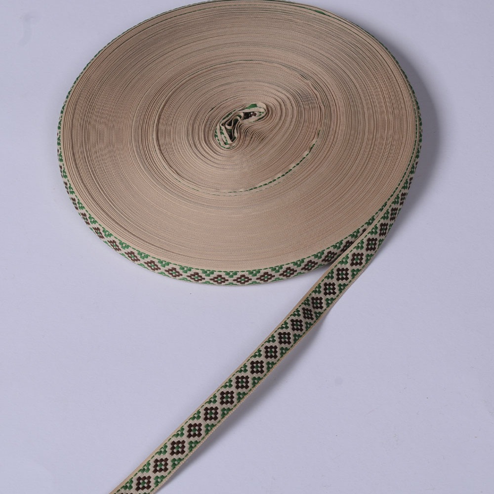 Лента отделочная бежевая с орнаментом зеленым 15мм 13В19Г27. Страна производитель: Украина. Отделочная тесьма с жаккардовым орнаментом используется для украшения одежды, декора элементов, отделки сумок, игрушек, различных аксессуаров в фольклорном стиле.