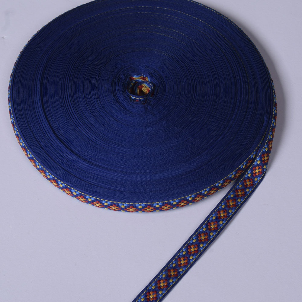 Лента отделочная синяя с орнаментом цветным 15мм 13В19Г27. Страна производитель: Украина. Отделочная тесьма с жаккардовым орнаментом используется для украшения одежды, декора элементов, отделки сумок, игрушек, различных аксессуаров в фольклорном стиле.