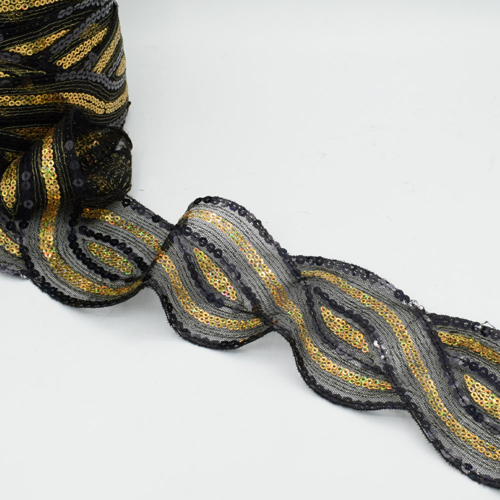 Тесьма декоративная с пайетками 50 мм черно-золотистая на черном. Страна производитель: Китай.