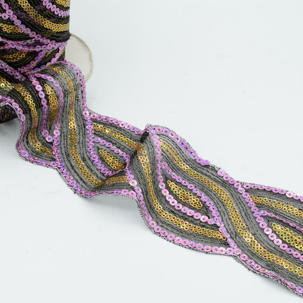 Тесьма декоративная с пайетками 50 мм сиренево-золотистая на черном. Страна производитель: Китай.