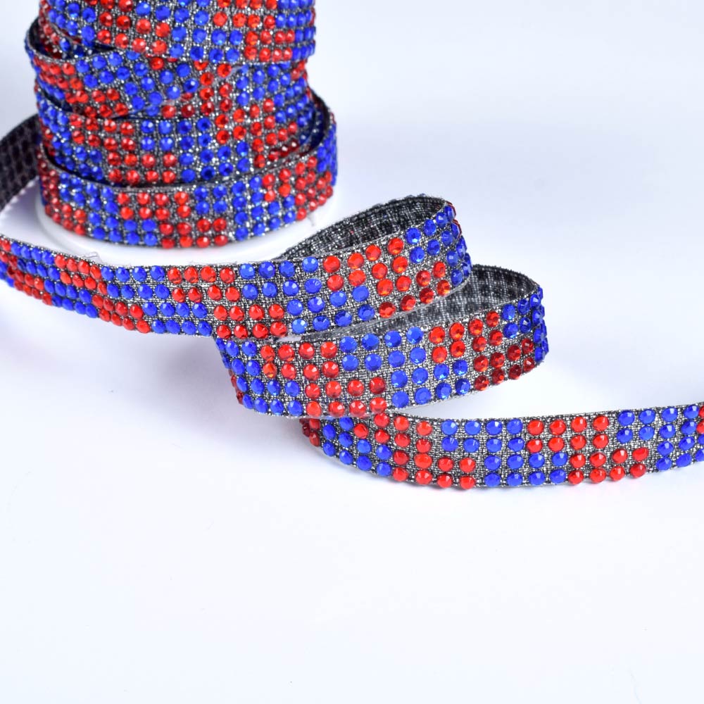 Тесьма отделочная клеевая со стразами 13 см красно-синяя купить в розницу и оптом