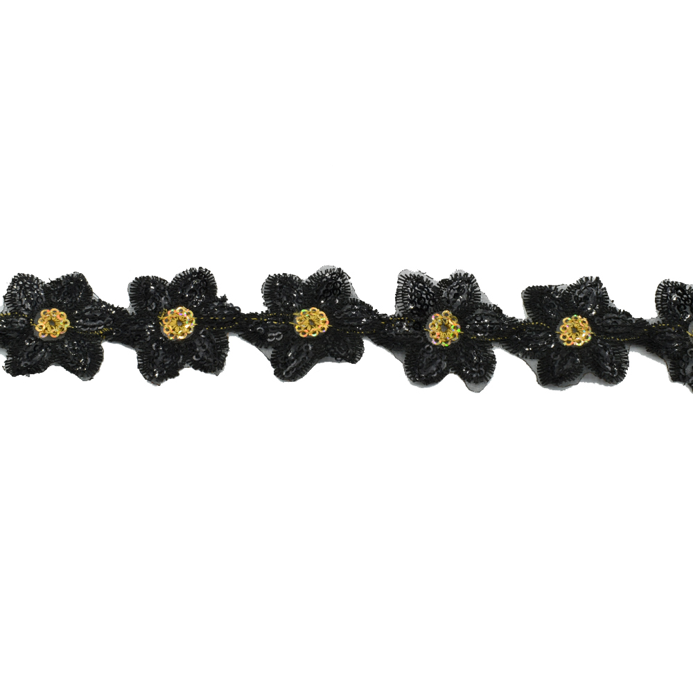 Тесьма пришивная с пайетками на капроне 35 мм цветы черно-желтая. Страна производитель: Китай.