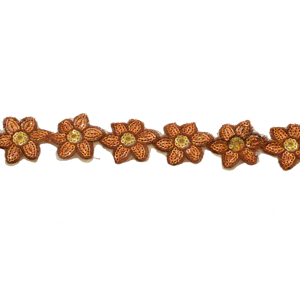 Тесьма пришивная с пайетками на капроне 35 мм цветы оранжево-коричневая. Страна производитель: Китай.