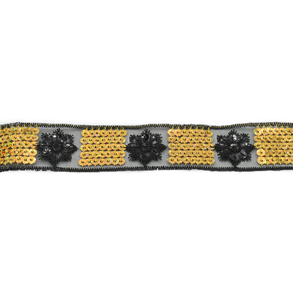 Тесьма с пайетками на капроне 30мм цветы черные с золотистым купить в розницу и оптом