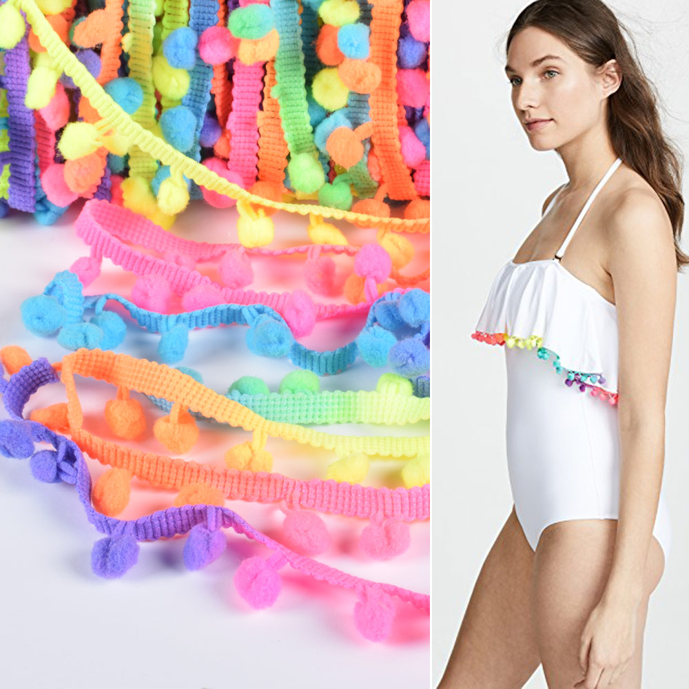 Тесьма с помпонами 10мм радуга (зеленый, синий, оранжевый, розовый, фиолетовый) купить в розницу и оптом