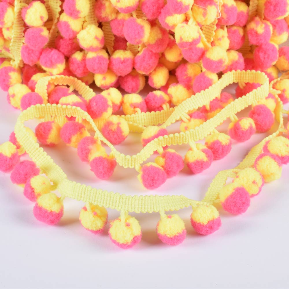 Тесьма с помпонами 10мм желтая, желто-розовые помпоны купить в розницу и оптом