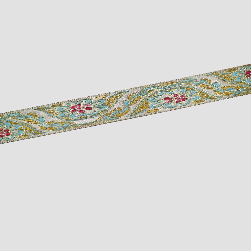 Тесьма жаккардовая с люрексом 15мм золотистым бирюзово-красная. Страна производитель: Китай.