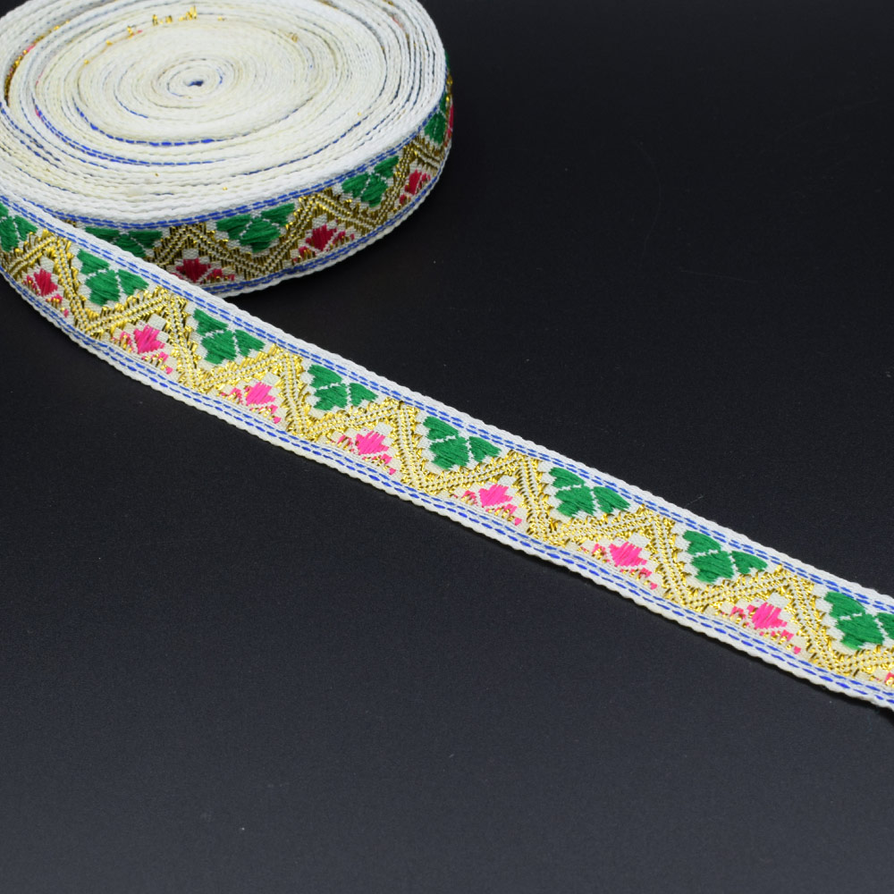 Тесьма жаккардовая с люрексом 22мм розово-зеленая на белом купить в розницу и оптом