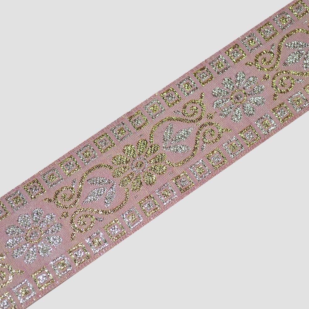 Тесьма жаккардовая с люрексом 36мм с орнамент серебристо-золотистый розовая. Страна производитель: Китай.