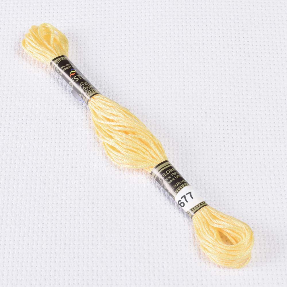 Мулине Bestex 677 8м, Старого золота, очень светлый. Страна производитель: Китай. Мулине Bestex высококачественные, декоративные, хлопковые нити для вышивания. Нити по 8 метров на 6 сложений. Мулине не линяет во время стирки, не выцветает от солнечных лучей, удобно в работе. Номера нитей соответствуют палитре французского мулине DMC, 100% хлопок.