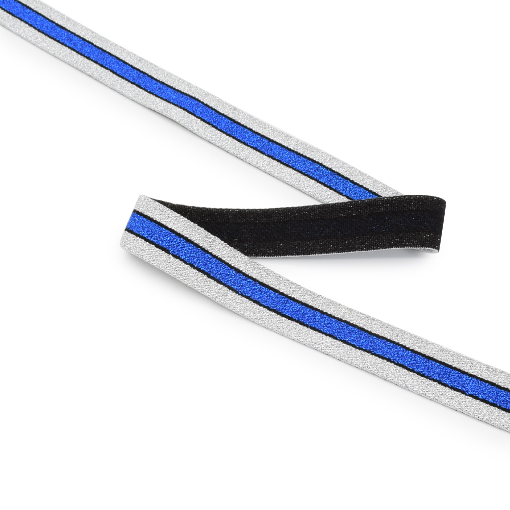 Резинка 20мм серебристая с сине-черной полоской с люрексом. Страна производитель: Китай.