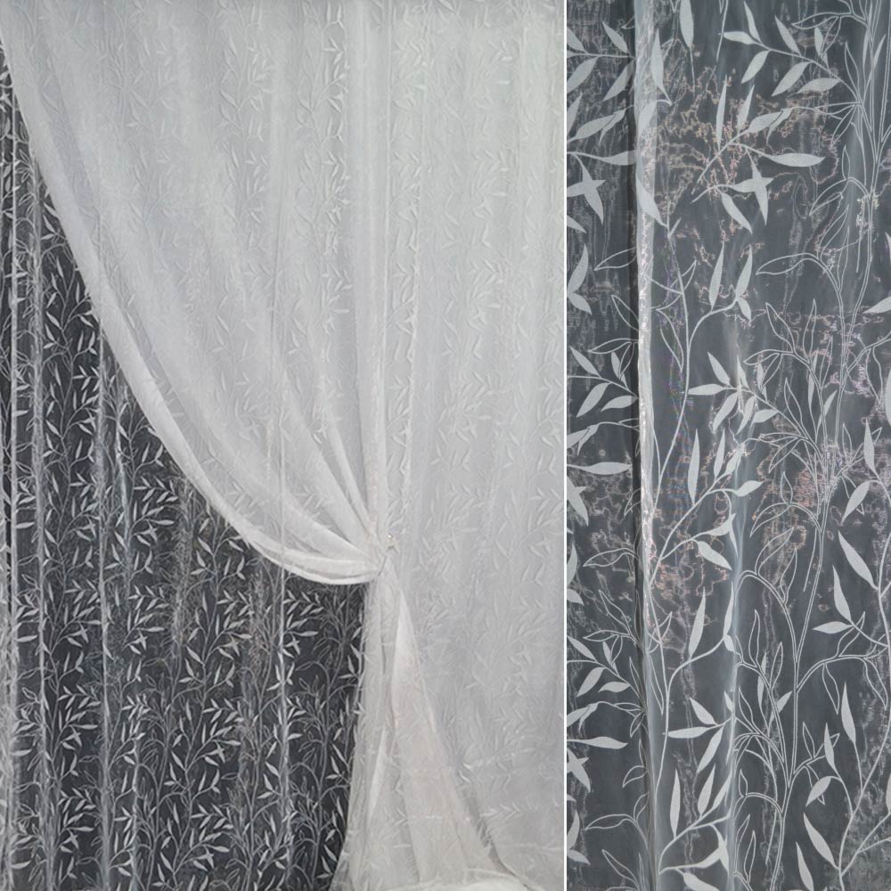 Органза тюль с флоком веточка с листьями белая, ш.275 купить в розницу и оптом