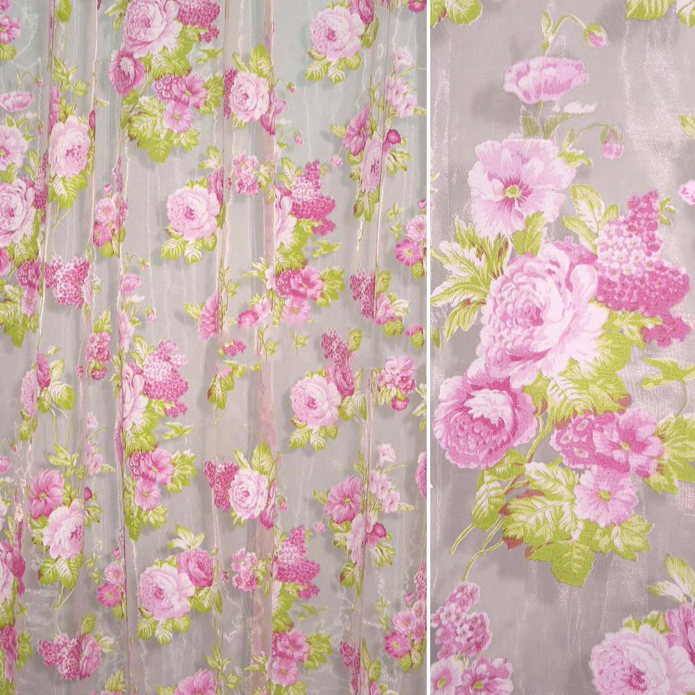 Органза тюль принт цветочный букет розовый, листья салатовые, розовая светлая, ш.270. Состав ткани: Полиэстер-100. Плотность ткани: 46 г/м.кв. Страна производитель: Южная Корея. Полупрозрачная, воздухопроницаемая, легкая ткань с дизайнерским рисунком. Материал формообразующий, при драпировке укладывается в воздушные складки и принимает устойчивую форму.