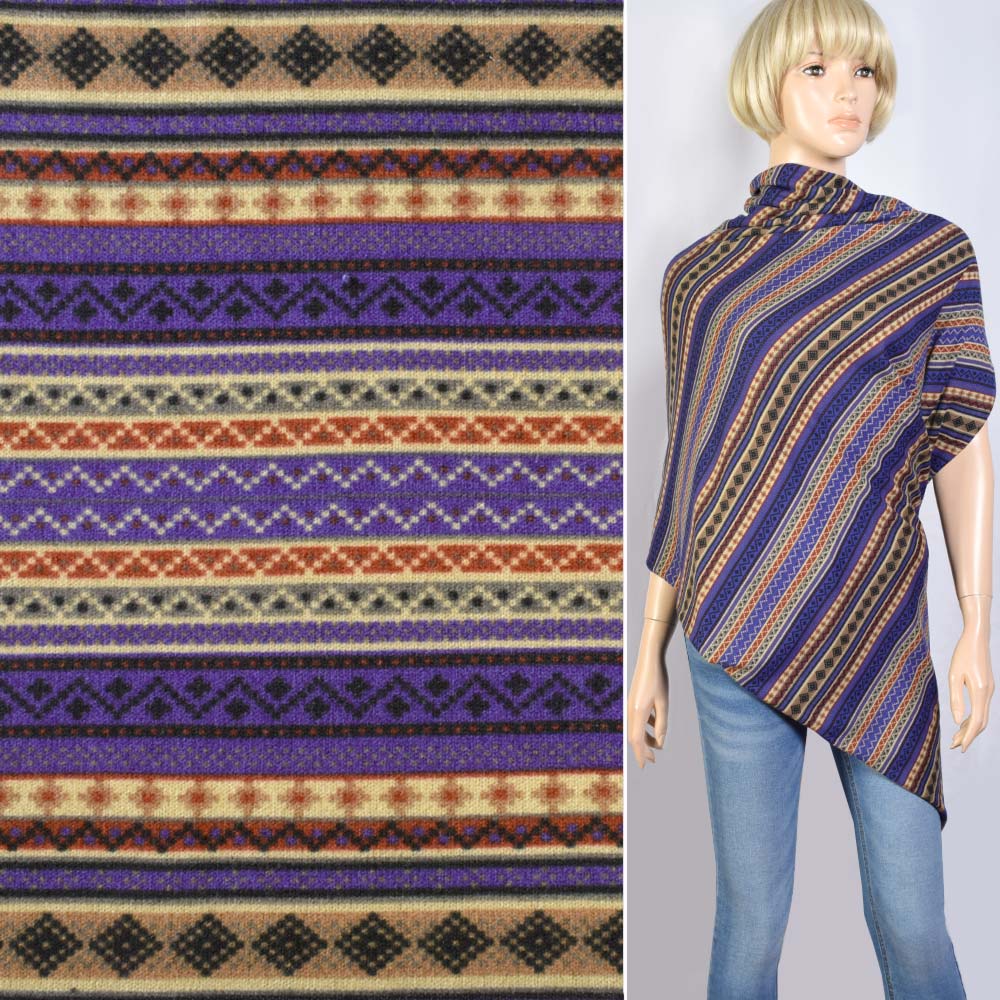 Трикотаж бежевый в фиолетовые, коричневые полоски с орнаментом, ш.160 купить в розницу и оптом