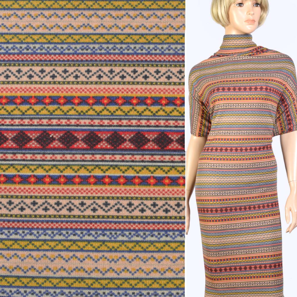 Трикотаж бежевый в оранжевые, желтые полоски с орнаментом, ш.170 купить в розницу и оптом