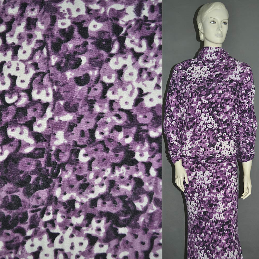 Трикотаж фиолетовый в пятна,ш.150. Состав ткани: Полиакрил-95, Эластан-5. Плотность ткани: 164 г/м.кв. Страна производитель: Южная Корея. Трикотаж - это мягкая плотная материя, не прозрачная. Приятная на ощупь, комфортная в носке. Благодаря содержанию синтетических материй, материал более износостойкий и надолго сохраняет свой первоначальный вид. Ткань отличается своей приятной текстурой, хорошей растяжимостью, практически не мнется, хорошо драпируется. Трикотаж достаточно простой в уходе. Используется для пошива платьев, спортивных костюмов, легких жакетов, поло, футболок и многого другого.