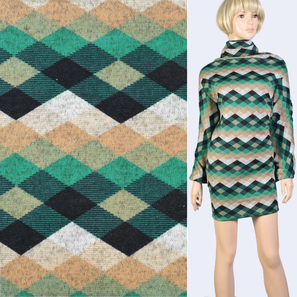 Трикотаж серый черно-зелено-бежевые ромбы, ш.170 купить в розницу и оптом
