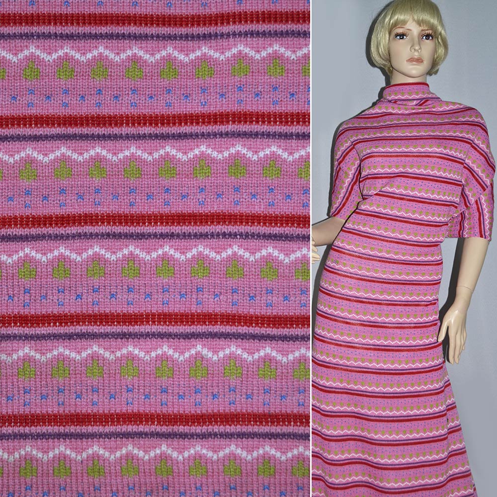 Трикотаж вязаный в розово-красные полоски с белым зигзагом ш.105. Состав ткани: Акрил-100. Плотность ткани: 274 г/м.кв. Страна производитель: Южная Корея. Трикотаж вязаный - это мягкая плотная материя, не прозрачная. Приятная на ощупь, комфортная в носке. Благодаря содержанию синтетических материй, материал более износостойкий и надолго сохраняет свой первоначальный вид. Ткань отличается своей приятной текстурой, хорошей растяжимостью, практически не мнется. Трикотаж достаточно простой в уходе. Используется для пошива платьев, спортивных костюмов, легких жакетов, поло, футболок и многого другого.