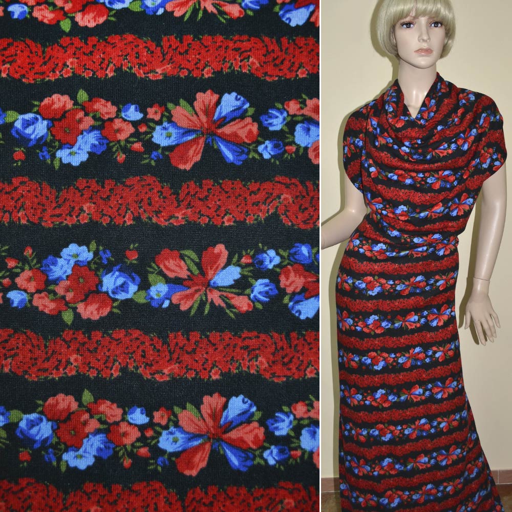 Трикотаж черный в полоски из красных и синих цветов ш.165 купить в розницу и оптом