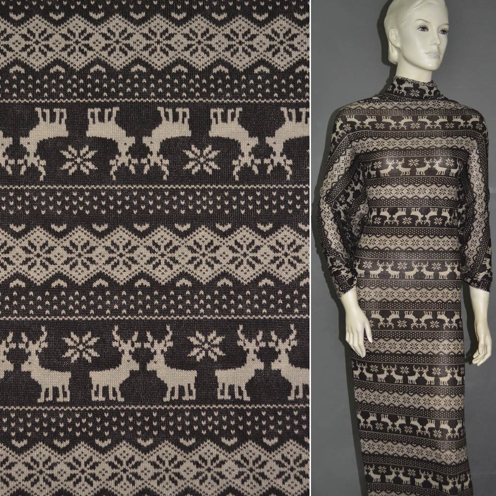Трикотаж коричневый с орнаментом и оленями ш.160. Состав ткани: Полиакрил-85, Шерсть-10, Эластан-5. Плотность ткани: 180 г/м.кв. Страна производитель: Южная Корея. Трикотаж - это мягкая плотная материя, не прозрачная. Приятная на ощупь, комфортная в носке. Благодаря содержанию синтетических материй, материал более износостойкий и надолго сохраняет свой первоначальный вид. Ткань отличается своей приятной текстурой, хорошей растяжимостью, практически не мнется. Трикотаж достаточно простой в уходе. Используется для пошива платьев, спортивных костюмов, легких жакетов, поло, футболок и многого другого.