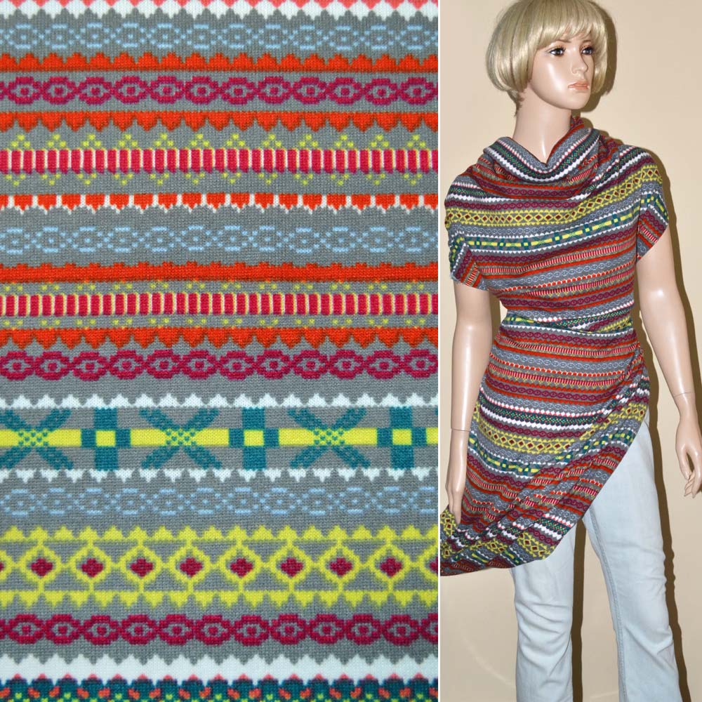 Трикотаж серый с бирюзово-желтым орнаментом ш.170. Состав ткани: Полиакрил-85, Шерсть-10, Эластан-5. Плотность ткани: 175 г/м.кв. Страна производитель: Южная Корея. Трикотаж - это мягкая плотная материя, не прозрачная. Приятная на ощупь, комфортная в носке. Благодаря содержанию синтетических материй, материал более износостойкий и надолго сохраняет свой первоначальный вид. Ткань отличается своей приятной текстурой, хорошей растяжимостью, практически не мнется. Трикотаж достаточно простой в уходе. Используется для пошива платьев, спортивных костюмов, легких жакетов, поло, футболок и многого другого.