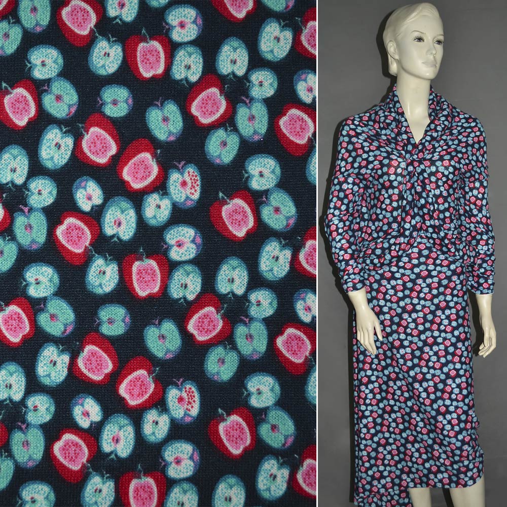Трикотаж синий темный в красно-голубые яблоки ш.160 купить в розницу и оптом