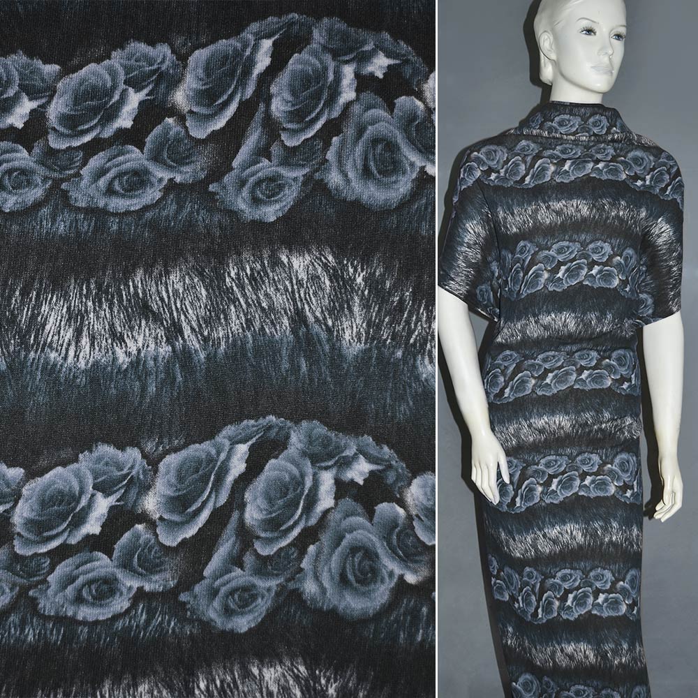 Трикотаж в черно-серые полосы с розами (раппорт) ш.160. Состав ткани: Полиакрил-85, Шерсть-10, Эластан-5. Плотность ткани: 202 г/м.кв. Страна производитель: Южная Корея. Трикотаж - это мягкая плотная материя, не прозрачная. Приятная на ощупь, комфортная в носке. Благодаря содержанию синтетических материй, материал более износостойкий и надолго сохраняет свой первоначальный вид. Ткань отличается своей приятной текстурой, хорошей растяжимостью, практически не мнется. Трикотаж достаточно простой в уходе. Используется для пошива платьев, спортивных костюмов, легких жакетов, поло, футболок и многого другого.