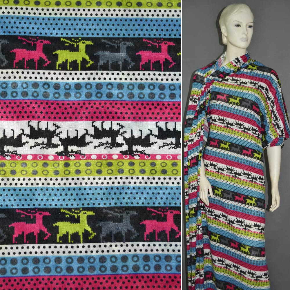 Трикотаж в молочно-черные и салатные полоски с оленями и кружочками ш.176 купить в розницу и оптом
