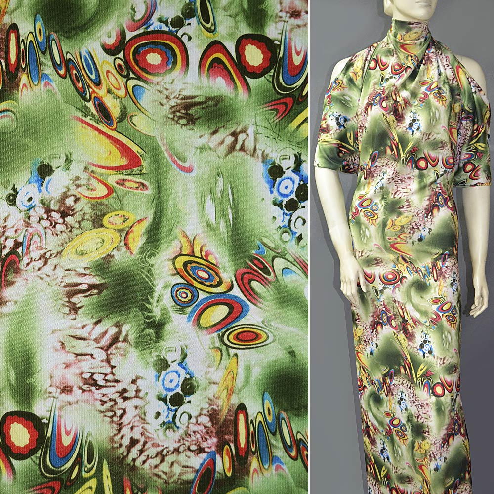 Трикотаж зеленый с разноцветной абстракцией ш.150 купить в розницу и оптом