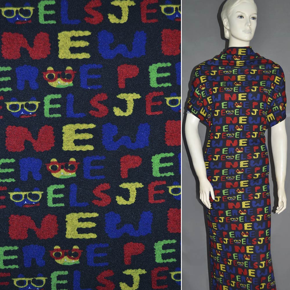 Трикотаж c шерстью черный с цветными буквами ш.165. Состав ткани: Полиакрил-60, Шерсть-35, Эластан-5. Плотность ткани: 208 г/м.кв. Страна производитель: Южная Корея. Трикотаж - это мягкая плотная материя, не прозрачная. Приятная на ощупь, комфортная в носке. Благодаря содержанию синтетических материй, материал более износостойкий и надолго сохраняет свой первоначальный вид. Наличие шерсти делает материал более теплым. Ткань отличается своей приятной текстурой, хорошей растяжимостью, практически не мнется. Трикотаж достаточно простой в уходе. Используется для пошива платьев, спортивных костюмов, легких жакетов, поло, футболок и многого другого.