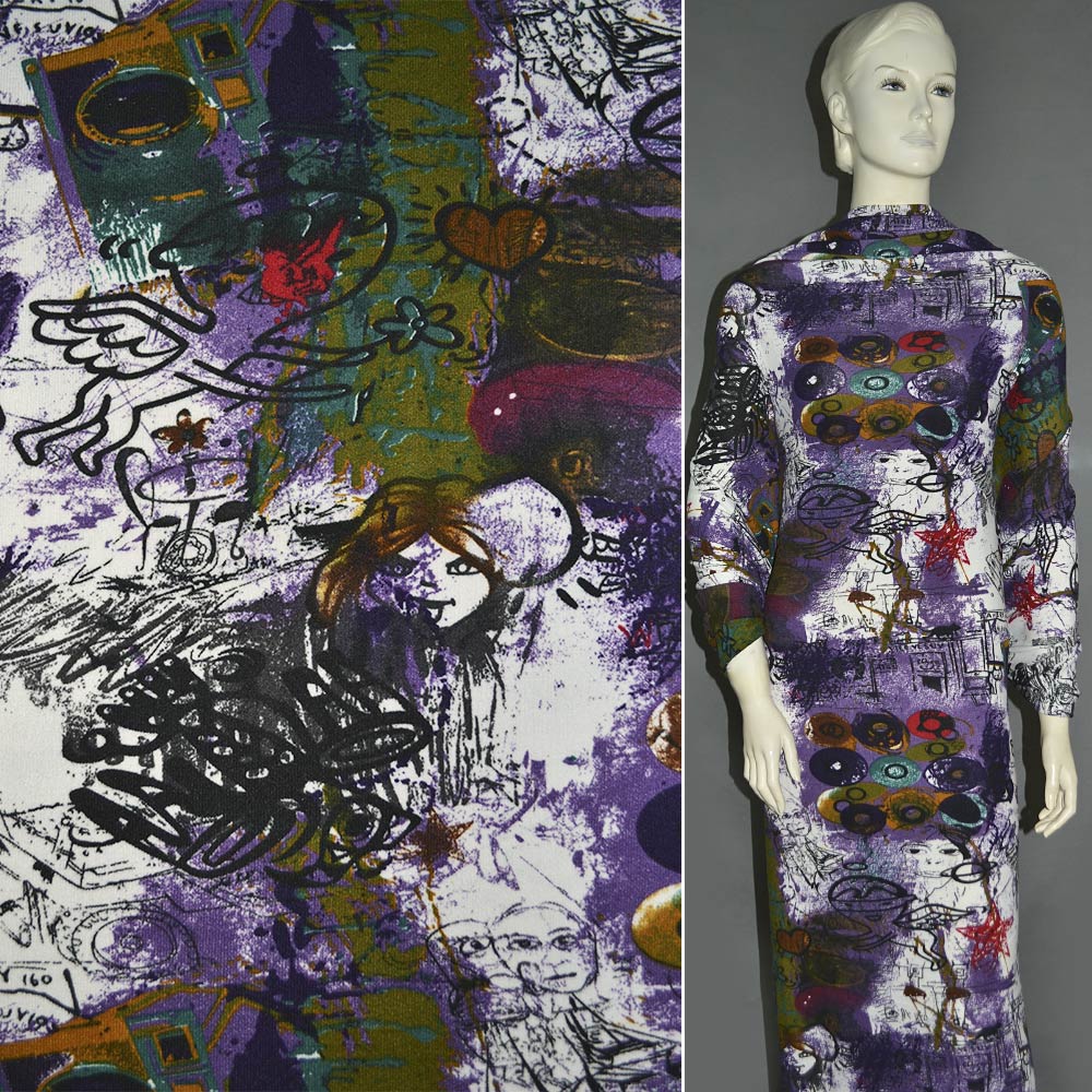 Трикотаж с шерстью белый с фиолетово-зеленой абстракцией ш.160 купить в розницу и оптом