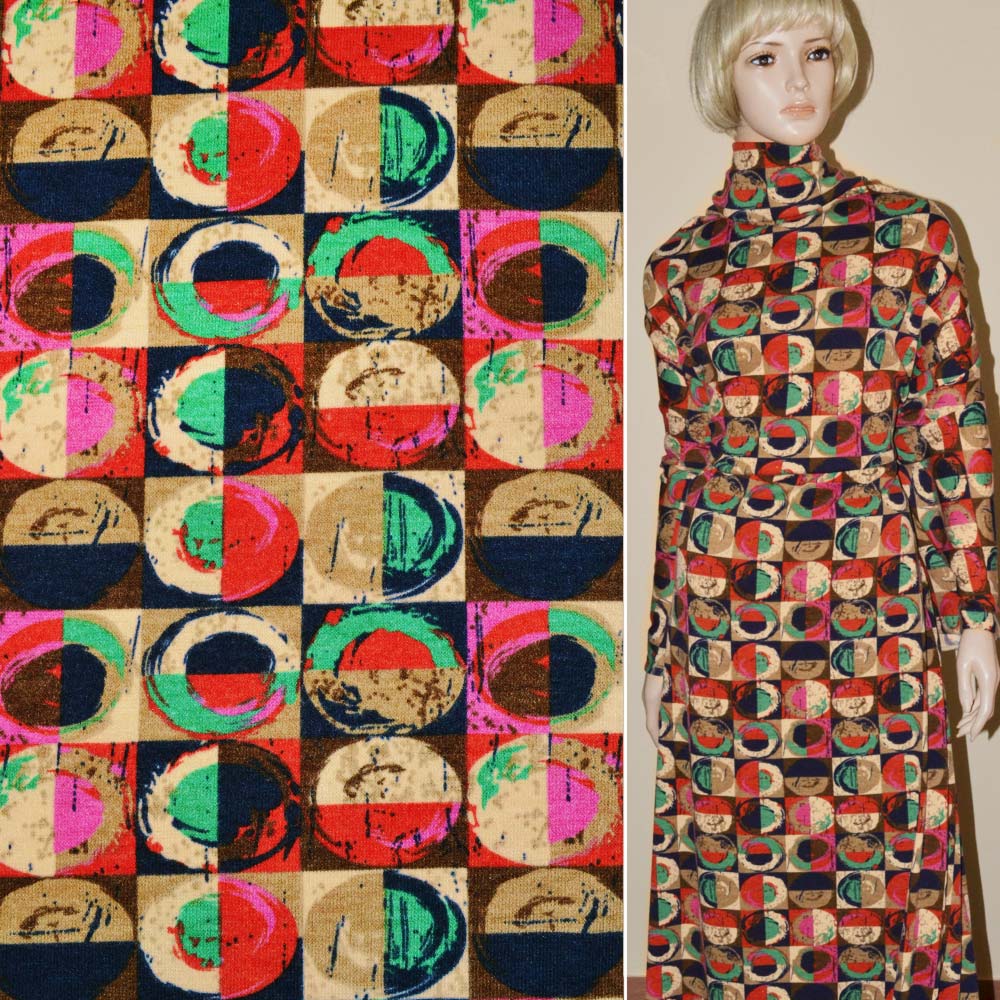 Трикотаж с шерстью в коричнево-оранжевые квадраты с цветными овалами ш.170 купить в розницу и оптом