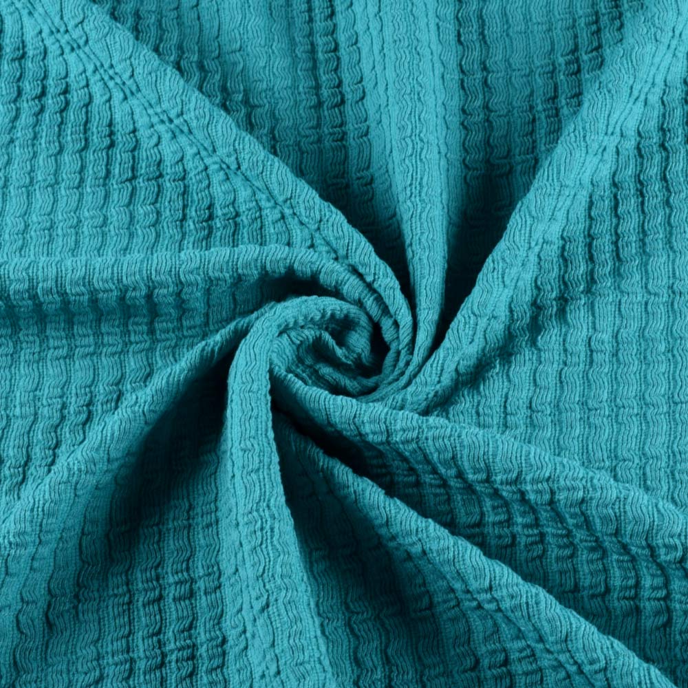 Трикотажное полотно сине-зеленое в жатую полоску ш.150. Состав ткани: Полиамид-60, Полиэстер-40. Плотность ткани: 227 г/м.кв. Страна производитель: Южная Корея. Трикотаж - это мягкая плотная материя, не прозрачная. Приятная на ощупь, комфортная в носке. Благодаря содержанию синтетических материй, материал более износостойкий и надолго сохраняет свой первоначальный вид. Ткань отличается своей приятной текстурой, хорошей растяжимостью, практически не мнется. Трикотаж достаточно простой в уходе. Используется для пошива платьев, спортивных костюмов, легких жакетов, поло, футболок и многого другого.