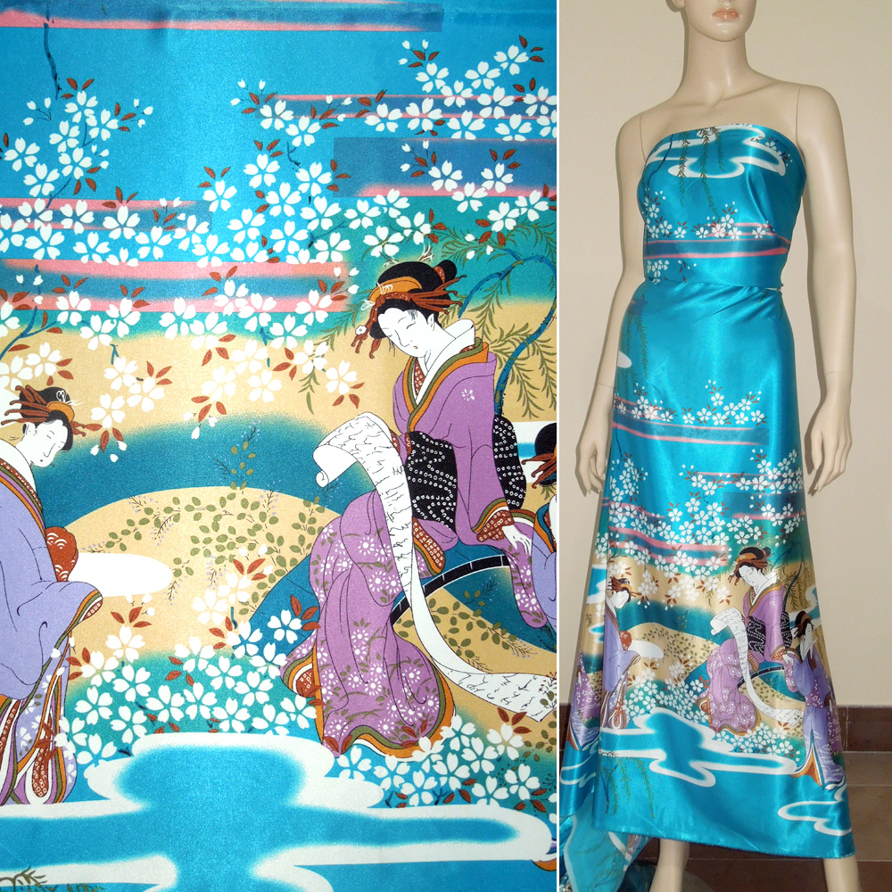 Атлас стрейч бирюзовый купон с восточными девушками ш.150. Состав ткани: Полиэстер-97, Эластан-3. Плотность ткани: 87 г/м.кв. Страна производитель: Южная Корея. Результатом атласного плетения является безупречная гладкость, блеск, крепость полотна. Атлас по характеристикам, внешнему виду напоминает натуральный шелк, но показатели плотности имеет более высокие. Наружная и внутренняя сторона выглядят по-разному. С изнанки материал не обладает блеском, на ощупь ощущается шероховатость. Атласный шелк широко применяется при изготовлении разнообразной одежды для женщин и мужчин. Из него шьют свадебные, вечерние и просто нарядные платья, блузы, рубашки, нижнее белье, постельное белье, делают аксессуары для волос, используют в качестве подкладки для шуб и пальто. Из атласного полотна изготавливают пуанты и декоративные ленты для отделки шляпок, штор и элементов одежды. Непрозрачный атлас хорошо скрывает солнечный свет, поэтому может использоваться при пошиве штор.