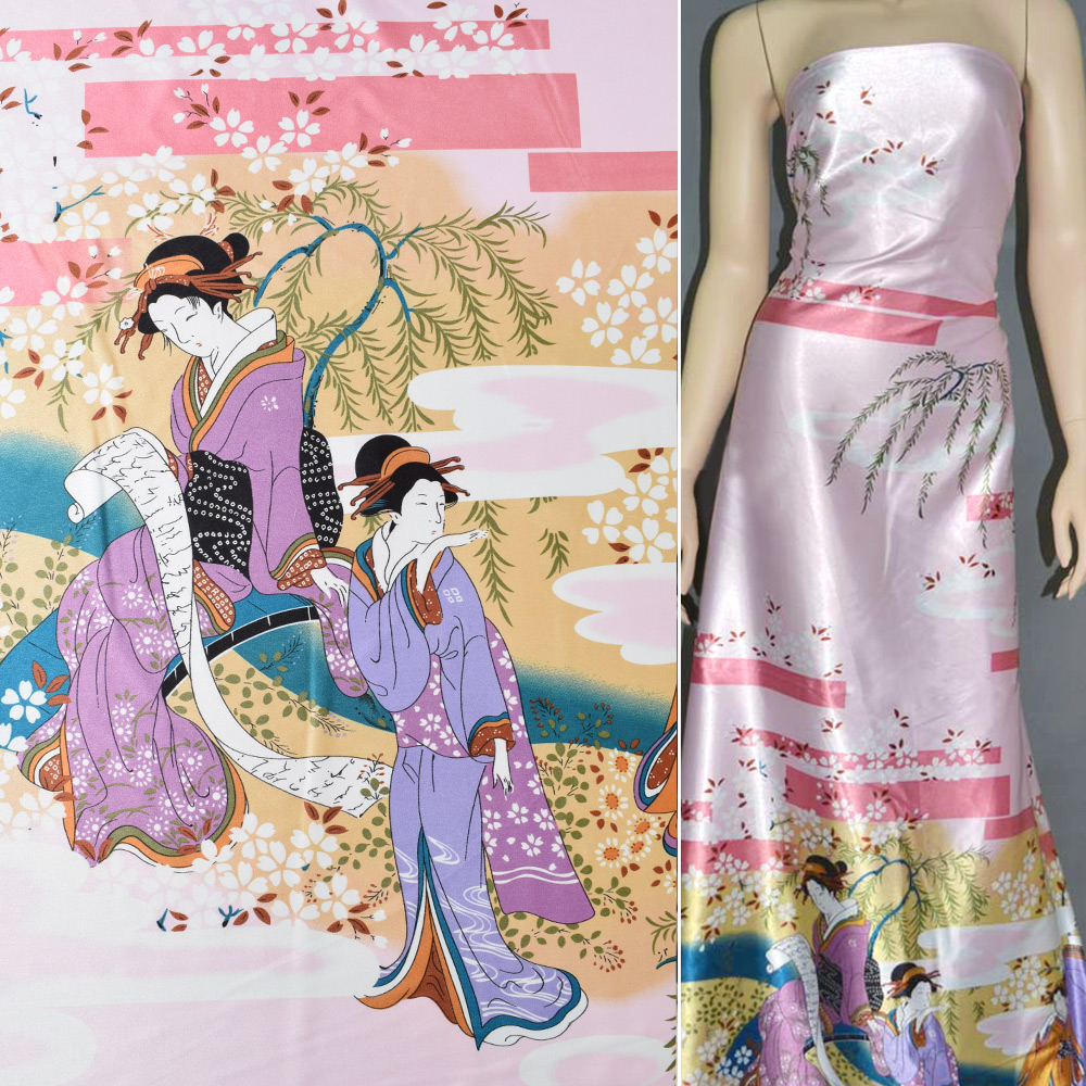 Атлас стрейч бледно-розов купон с восточными девушками ш.150 купить в розницу и оптом