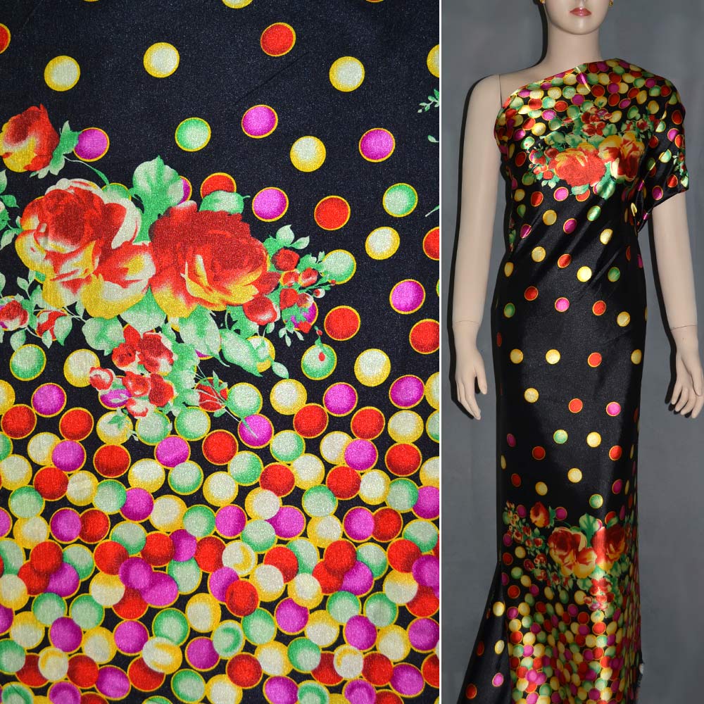 Атлас стрейч черный, двухсторонний купон в разноцветные круги ш.150 купить в розницу и оптом