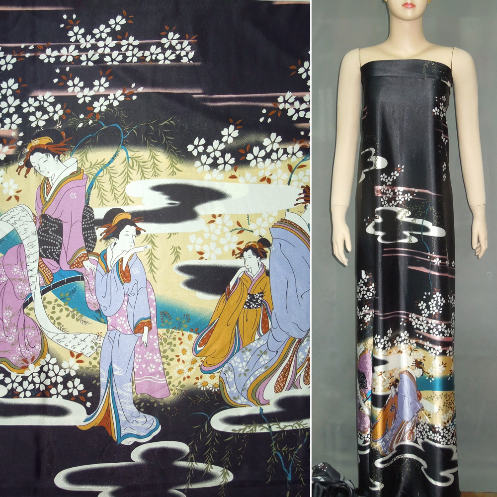Атлас стрейч черный купон с восточными девушками ш.150. Состав ткани: Полиэстер-97, Эластан-3. Плотность ткани: 86 г/м.кв. Страна производитель: Южная Корея. Атлас стрейч имеет гладкую блестящую атласную сторону и матовую изнанку. Ткань имеет плотное переплетение, одностороннее растяжение по ширине ткани. Содержание эластана делает возможность применить атлас для облегающей одежды. Эта ткань идеально подходит для платьев, блузок, белья, юбок, танцевальной одежды и многого другого. Атлас мягко драпируется, поэтому подходит для изготовления различных сложных моделей. Атлас доступен во многих цветах. Покупайте больше и экономьте больше, чтобы воспользоваться эксклюзивными скидками на количество ткани.