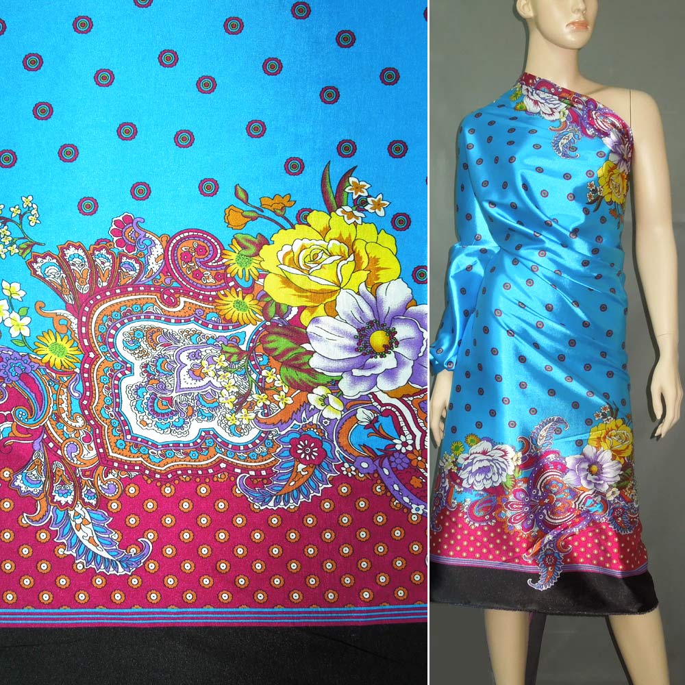 Атлас стрейч голубой двухсторонний черно-малиновый купон в цветы ш.150 купить в розницу и оптом