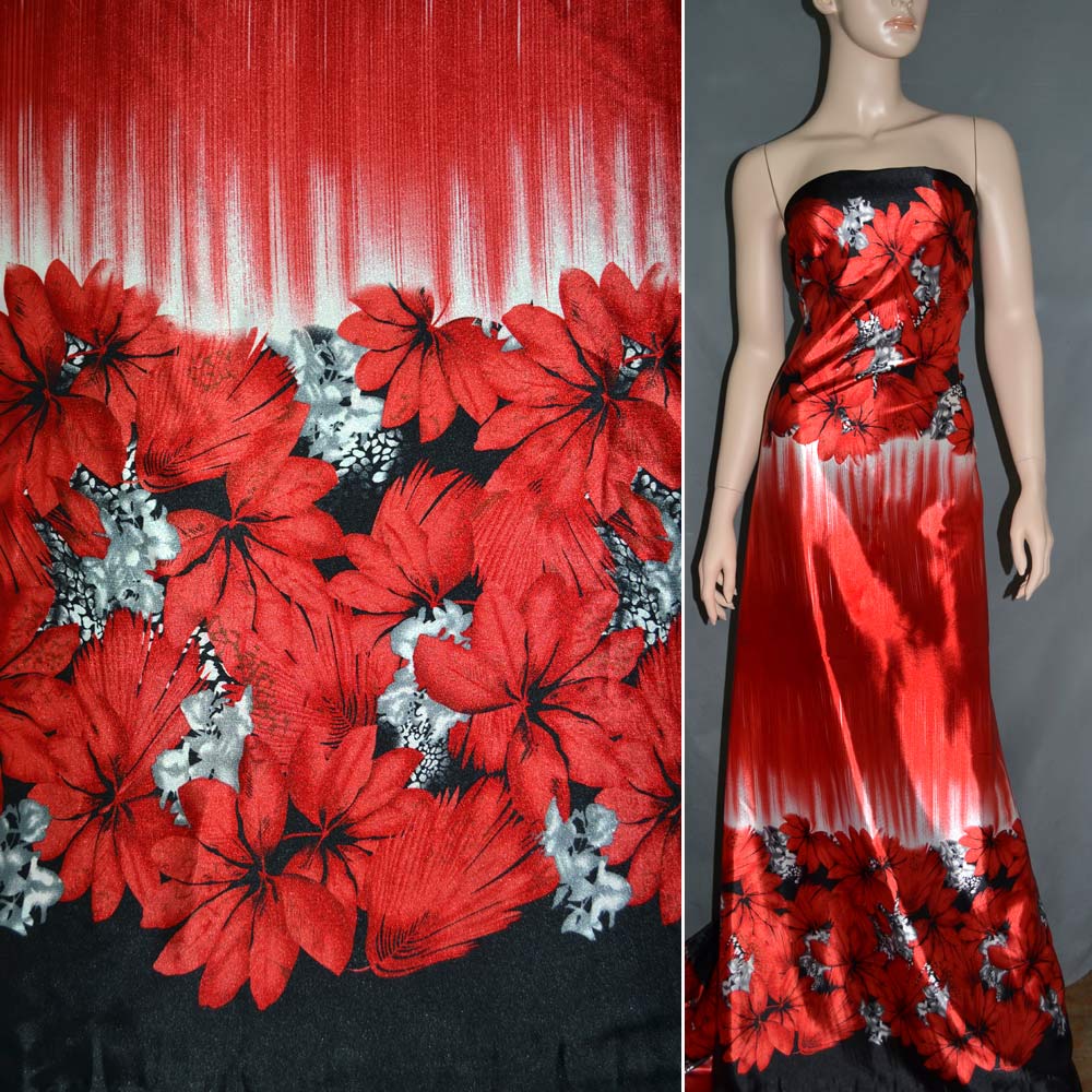 Атлас стрейч красный, двухсторонний купон с красно-черными цветами ш.150 купить в розницу и оптом