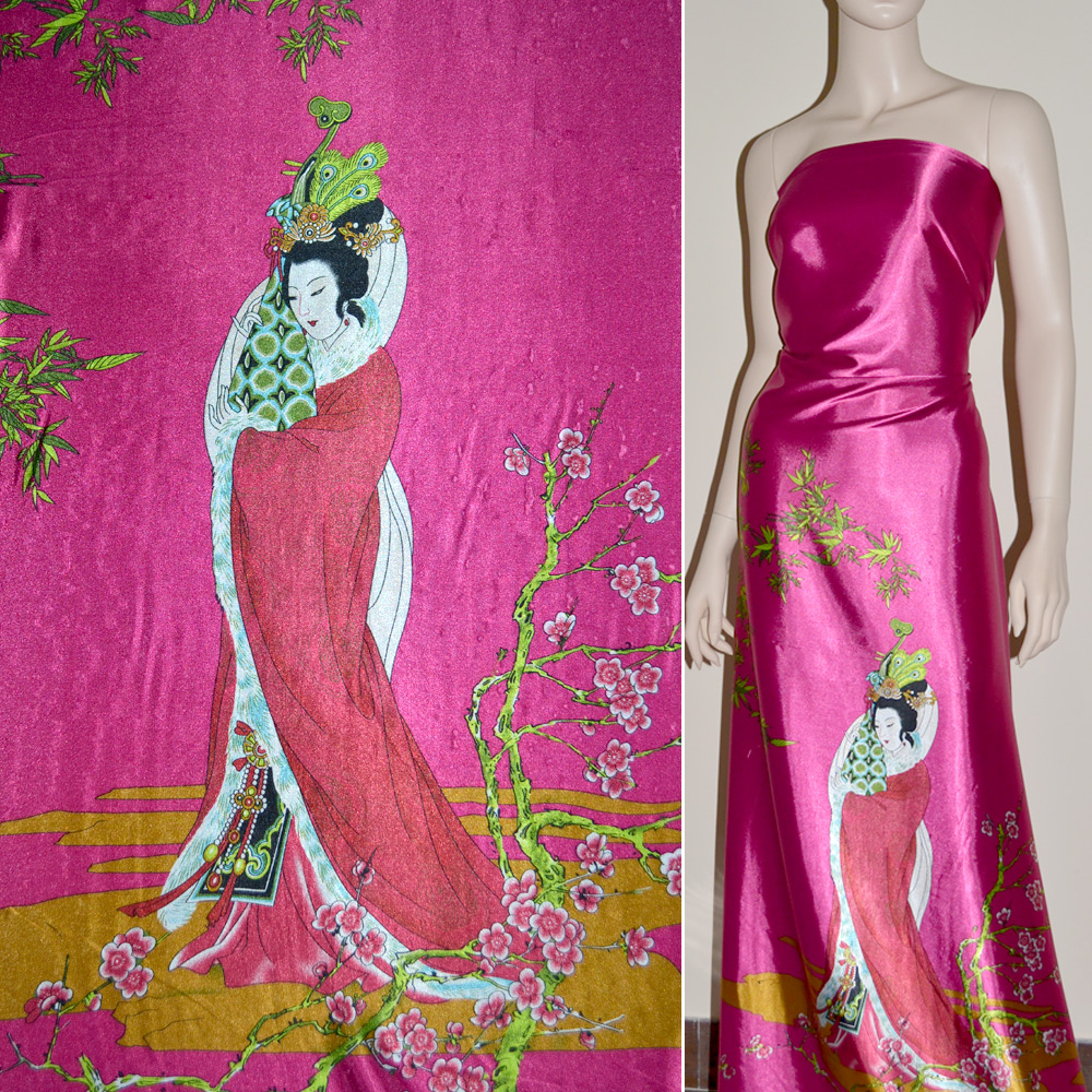 Атлас стрейч малиновый купон с восточными девушками ш.150. Состав ткани: Полиэстер-97, Эластан-3. Плотность ткани: 83 г/м.кв. Страна производитель: Южная Корея. Ткань атлас по описанию относится к разновидностям шелка (полушелка). Отличительной особенностью полотна является специальное плетение, называемое атласным. Гладкость лицевой стороны обеспечивает то, что продольные нити чередуются с основой в определённой последовательности. Уток выходит на лицо ткани через 5-6 нитей основы.