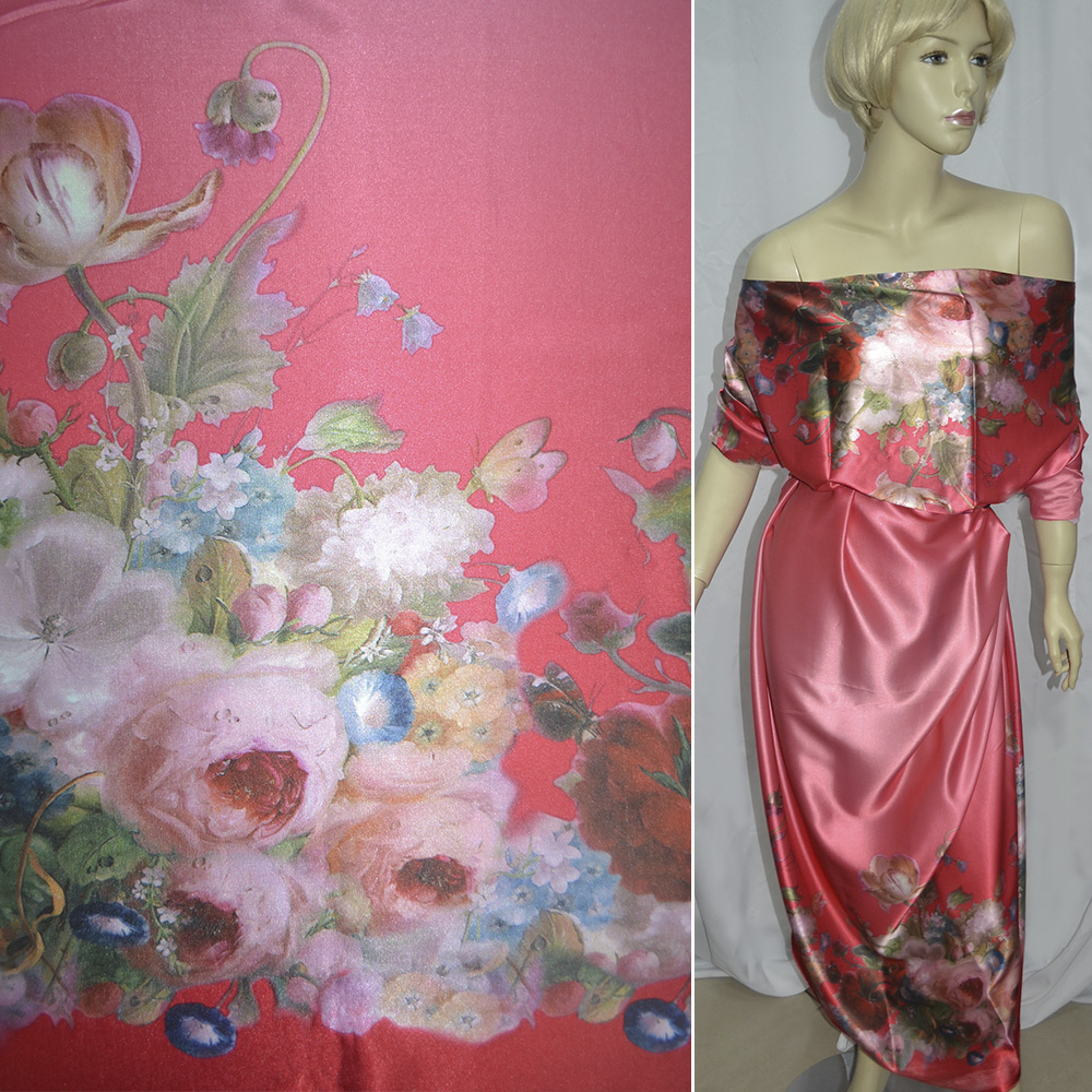 Атлас стрейч розово-красный, двухсторонний купон цветы ш.150 купить в розницу и оптом