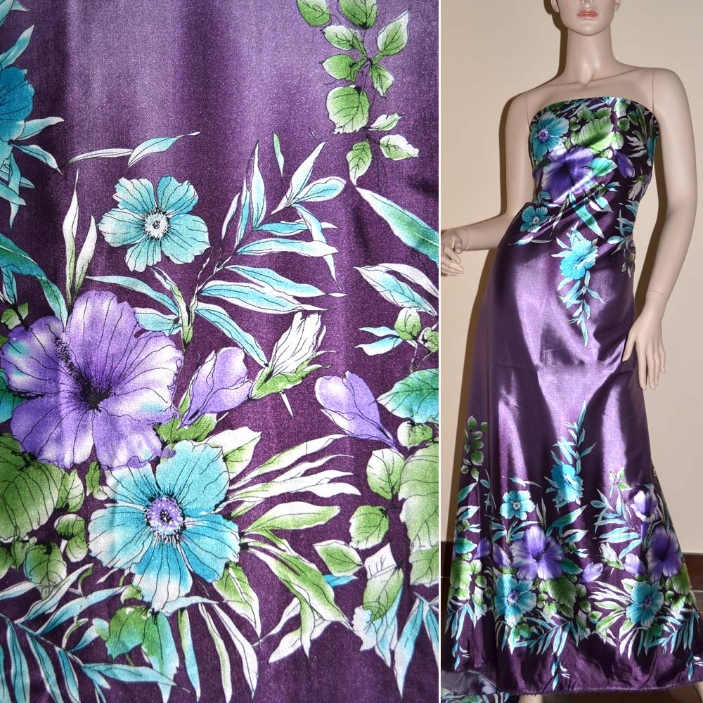 Атлас стрейч темно-фиолетовый, 2-ст. купон в бирюзово-фиолетовые цветы ш.150 купить в розницу и оптом