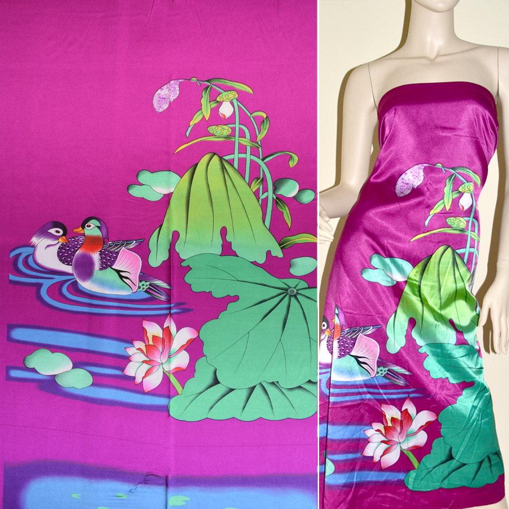 Атлас стрейч темно-малиновый с зеленым рисунком птицы раппорт ш.120. Состав ткани: Полиэстер-97, Эластан-3. Плотность ткани: 82 г/м.кв. Страна производитель: Южная Корея. Самой популярной тканью, которая используется при пошиве свадебных и вечерних платьев, вот уже много лет является атлас. С арабского языка это слово переводится как «гладкий» и оно с точностью характеризует внешний вид этого материала. Атлас представляет собой плотную шелковую или полушелковую ткань атласного переплетения, при котором нить утка выходит на лицевую сторону через пять и более нитей основы.
