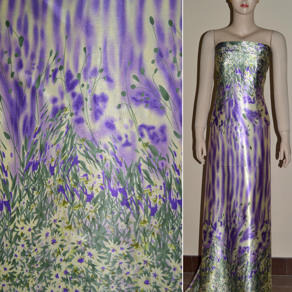 Атлас стрейч желто-сиреневый, двухсторонний купон цветы ш.150 купить в розницу и оптом