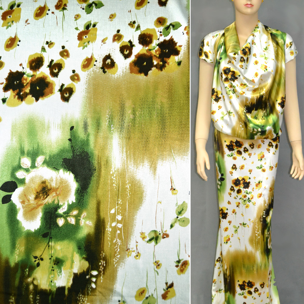 Атлас стрейч белый коричневый в салатные вставки и цветы ш.120. Состав ткани: Полиэстер-97, Эластан-3. Плотность ткани: 84 г/м.кв. Страна производитель: Южная Корея. Блестящая гладкая ткань отлично подходит для пошива идеальных праздничных платьев, позволяющих стать королевой любого вечера. Лицевая сторона ткани получается гладкой, глянцевой, изнаночная сторона — матовой. Роскошь и блеск дарит атласная ткань. Сияющий материал приятен на ощупь и напоминает прохладную воду. Он нежно касается кожи и мягко струится вниз, подчеркивая контуры фигуры. Красивый и праздничный внешний вид.