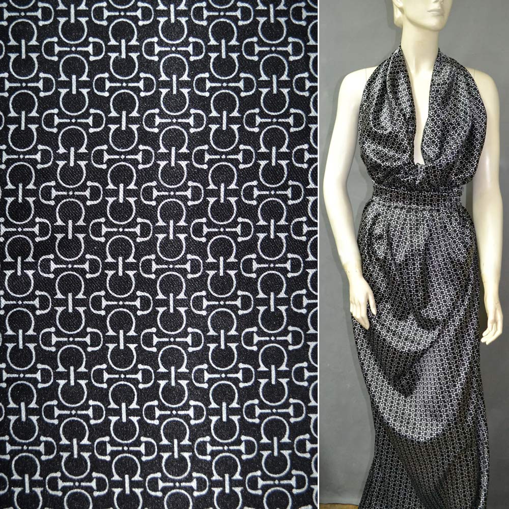 Атлас стрейч черный с белыми подковками ш.120. Состав ткани: Полиэстер-97, Эластан-3. Плотность ткани: 82 г/м.кв. Страна производитель: Южная Корея. Самой популярной тканью, которая используется при пошиве свадебных и вечерних платьев, вот уже много лет является атлас. С арабского языка это слово переводится как «гладкий» и оно с точностью характеризует внешний вид этого материала. Атлас представляет собой плотную шелковую или полушелковую ткань атласного переплетения, при котором нить утка выходит на лицевую сторону через пять и более нитей основы.