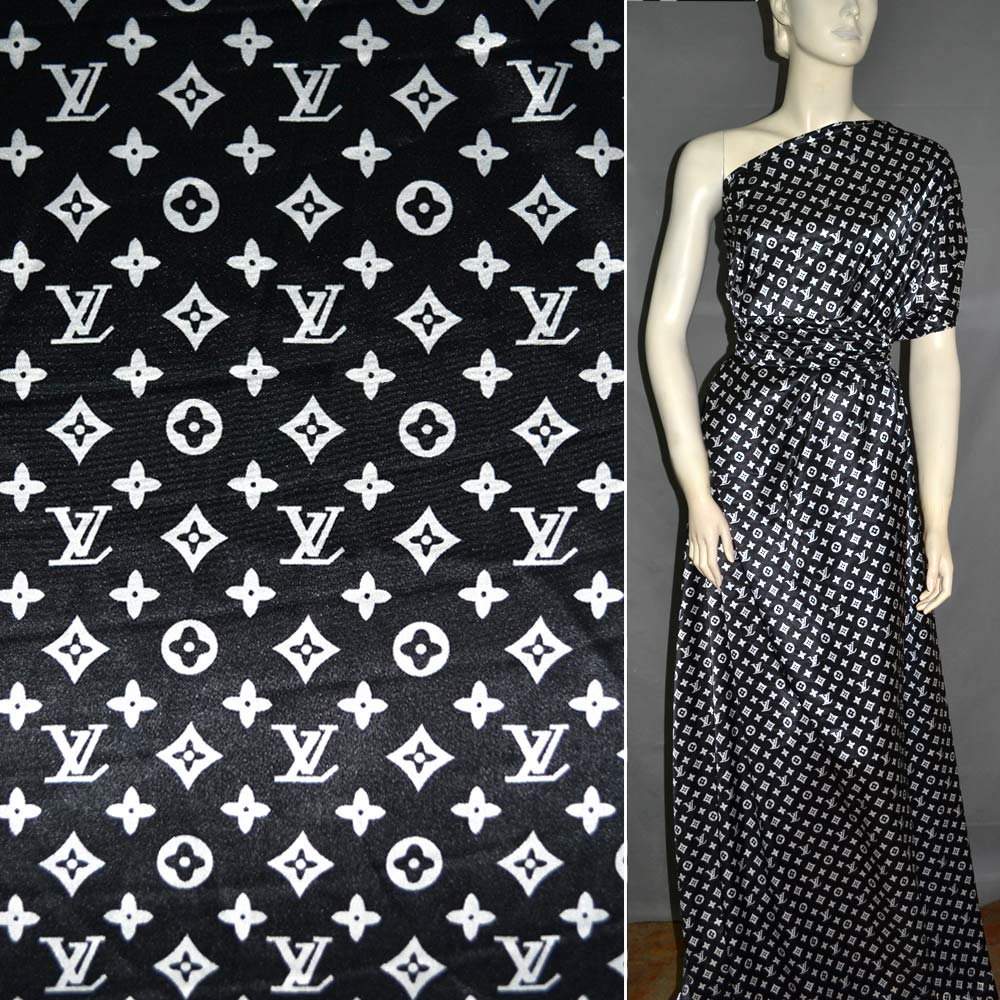 Атлас стрейч черный с крупным логотипом LV ш.120. Состав ткани: Полиэстер-97, Эластан-3. Плотность ткани: 83 г/м.кв. Страна производитель: Южная Корея. Блестящая гладкая ткань отлично подходит для пошива идеальных праздничных платьев, позволяющих стать королевой любого вечера. Лицевая сторона ткани получается гладкой, глянцевой, изнаночная сторона — матовой. Роскошь и блеск дарит атласная ткань. Сияющий материал приятен на ощупь и напоминает прохладную воду. Он нежно касается кожи и мягко струится вниз, подчеркивая контуры фигуры. Красивый и праздничный внешний вид.